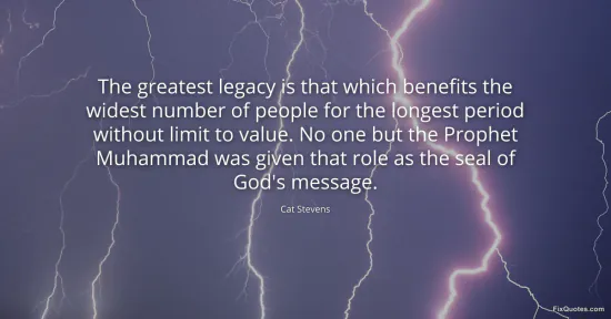 Stevens, Cat. "The greatest legacy is that which benefits the widest number of people for the longest period without limit to value. No one but the Prophet Muhammad was given that role as the seal of God's message." FixQuotes. January 17, 2026. https://fixquotes.com/quotes/the-greatest-legacy-is-that-which-benefits-the-33550/.