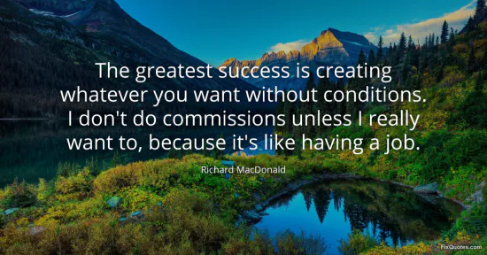 MacDonald, Richard. "The greatest success is creating whatever you want without conditions. I don't do commissions unless I really want to, because it's like having a job." FixQuotes. January 15, 2026. https://fixquotes.com/quotes/the-greatest-success-is-creating-whatever-you-85116/.