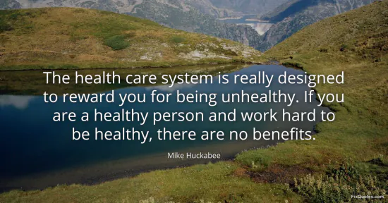 Huckabee, Mike. "The health care system is really designed to reward you for being unhealthy. If you are a healthy person and work hard to be healthy, there are no benefits." FixQuotes. January 16, 2026. https://fixquotes.com/quotes/the-health-care-system-is-really-designed-to-134208/.