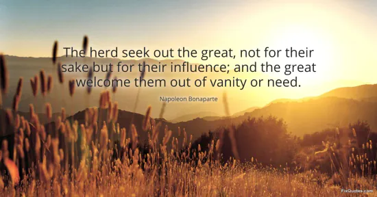 Bonaparte, Napoleon. "The herd seek out the great, not for their sake but for their influence; and the great welcome them out of vanity or need." FixQuotes. January 17, 2026. https://fixquotes.com/quotes/the-herd-seek-out-the-great-not-for-their-sake-34186/.