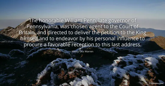 Warren, Mercy Otis. "The honorable William Penn, late governor of Pennsylvania, was chosen agent to the Court of Britain, and directed to deliver the petition to the King himself and to endeavor by his personal influence to procure a favorable reception to this last address." FixQuotes. January 18, 2026. https://fixquotes.com/quotes/the-honorable-william-penn-late-governor-of-6801/.