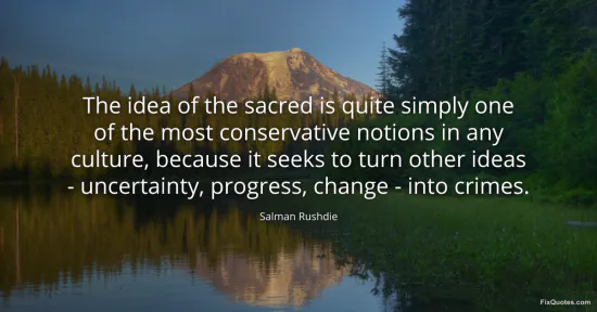 Rushdie, Salman. "The idea of the sacred is quite simply one of the most conservative notions in any culture, because it seeks to turn other ideas - uncertainty, progress, change - into crimes." FixQuotes. January 15, 2026. https://fixquotes.com/quotes/the-idea-of-the-sacred-is-quite-simply-one-of-the-86190/.