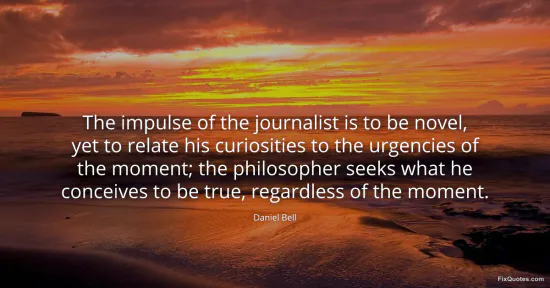 Bell, Daniel. "The impulse of the journalist is to be novel, yet to relate his curiosities to the urgencies of the moment; the philosopher seeks what he conceives to be true, regardless of the moment." FixQuotes. January 16, 2026. https://fixquotes.com/quotes/the-impulse-of-the-journalist-is-to-be-novel-yet-117116/.