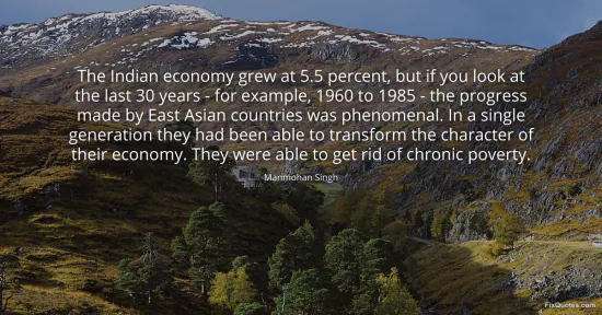 Singh, Manmohan. "The Indian economy grew at 5.5 percent, but if you look at the last 30 years - for example, 1960 to 1985 - the progress made by East Asian countries was phenomenal. In a single generation they had been able to transform the character of their economy. They were able to get rid of chronic poverty." FixQuotes. January 16, 2026. https://fixquotes.com/quotes/the-indian-economy-grew-at-55-percent-but-if-you-104491/.