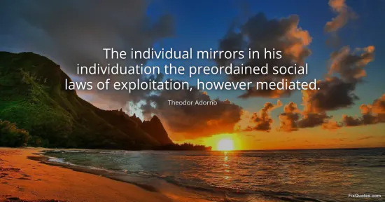 Adorno, Theodor. "The individual mirrors in his individuation the preordained social laws of exploitation, however mediated." FixQuotes. January 17, 2026. https://fixquotes.com/quotes/the-individual-mirrors-in-his-individuation-the-28507/.