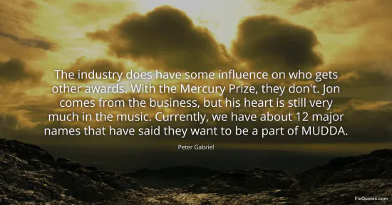 Gabriel, Peter. (2026, January 16). The industry does have some influence on who gets other awards. With the Mercury Prize, they don't. Jon comes from the business, but his heart is still very much in the music. Currently, we have about 12 major names that have said they want to be a part of MUDDA. FixQuotes. https://fixquotes.com/quotes/the-industry-does-have-some-influence-on-who-gets-109109/