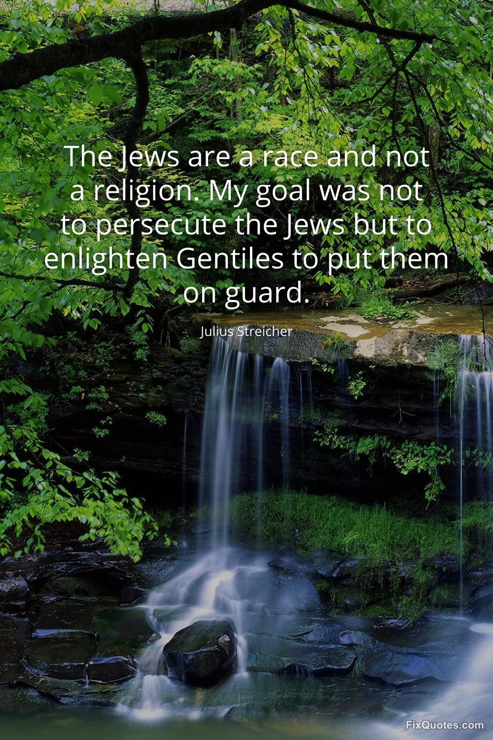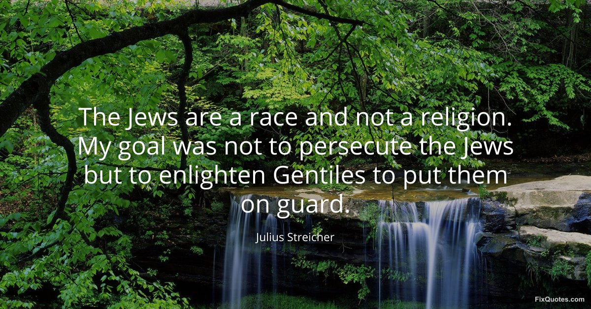 Streicher, Julius. (2026, January 16). The Jews are a race and not a religion. My goal was not to persecute the Jews but to enlighten Gentiles to put them on guard. FixQuotes. https://fixquotes.com/quotes/the-jews-are-a-race-and-not-a-religion-my-goal-84124/