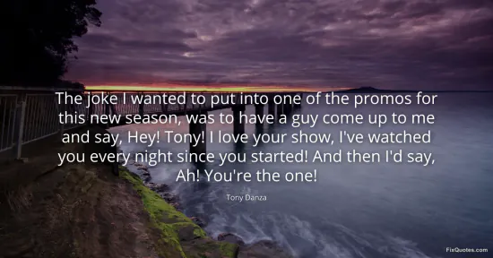 Danza, Tony. "The joke I wanted to put into one of the promos for this new season, was to have a guy come up to me and say, Hey! Tony! I love your show, I've watched you every night since you started! And then I'd say, Ah! You're the one!" FixQuotes. January 16, 2026. https://fixquotes.com/quotes/the-joke-i-wanted-to-put-into-one-of-the-promos-129631/.