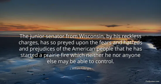 Fulbright, J. William. (2026, January 17). The junior senator from Wisconsin, by his reckless charges, has so preyed upon the fears and hatreds and prejudices of the American people that he has started a prairie fire which neither he nor anyone else may be able to control. FixQuotes. https://fixquotes.com/quotes/the-junior-senator-from-wisconsin-by-his-reckless-48727/