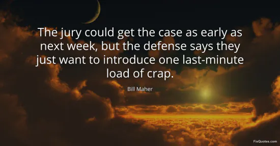 Maher, Bill. (2026, January 18). The jury could get the case as early as next week, but the defense says they just want to introduce one last-minute load of crap. FixQuotes. https://fixquotes.com/quotes/the-jury-could-get-the-case-as-early-as-next-week-15384/