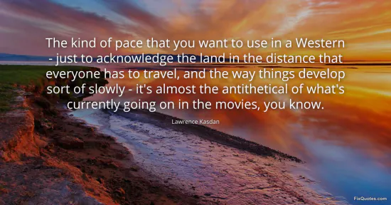 Kasdan, Lawrence. (2026, January 15). The kind of pace that you want to use in a Western - just to acknowledge the land in the distance that everyone has to travel, and the way things develop sort of slowly - it's almost the antithetical of what's currently going on in the movies, you know. FixQuotes. https://fixquotes.com/quotes/the-kind-of-pace-that-you-want-to-use-in-a-164142/