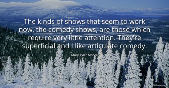 Moore, Mary Tyler. "The kinds of shows that seem to work now, the comedy shows, are those which require very little attention. They're superficial and I like articulate comedy." FixQuotes. January 16, 2026. https://fixquotes.com/quotes/the-kinds-of-shows-that-seem-to-work-now-the-93698/.