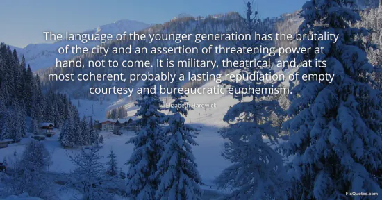 Hardwick, Elizabeth. (2026, February 17). The language of the younger generation has the brutality of the city and an assertion of threatening power at hand, not to come. It is military, theatrical, and, at its most coherent, probably a lasting repudiation of empty courtesy and bureaucratic euphemism. FixQuotes. https://fixquotes.com/quotes/the-language-of-the-younger-generation-has-the-111034/