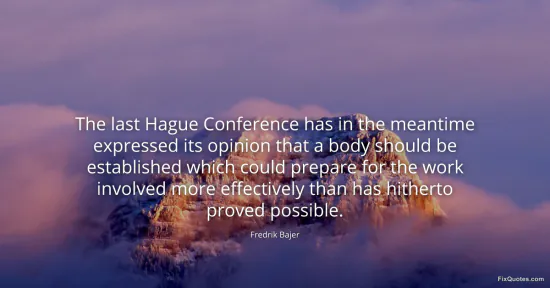 Bajer, Fredrik. "The last Hague Conference has in the meantime expressed its opinion that a body should be established which could prepare for the work involved more effectively than has hitherto proved possible." FixQuotes. January 17, 2026. https://fixquotes.com/quotes/the-last-hague-conference-has-in-the-meantime-78771/.