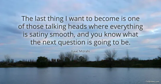 Mizrahi, Isaac. "The last thing I want to become is one of those talking heads where everything is satiny smooth, and you know what the next question is going to be." FixQuotes. February 20, 2026. https://fixquotes.com/quotes/the-last-thing-i-want-to-become-is-one-of-those-13444/.