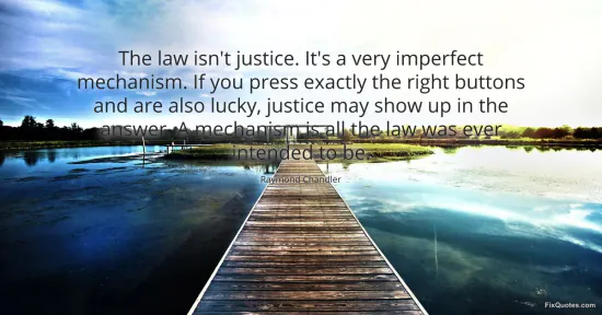 Chandler, Raymond. "The law isn't justice. It's a very imperfect mechanism. If you press exactly the right buttons and are also lucky, justice may show up in the answer. A mechanism is all the law was ever intended to be." FixQuotes. January 13, 2026. https://fixquotes.com/quotes/the-law-isnt-justice-its-a-very-imperfect-96851/.