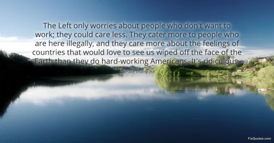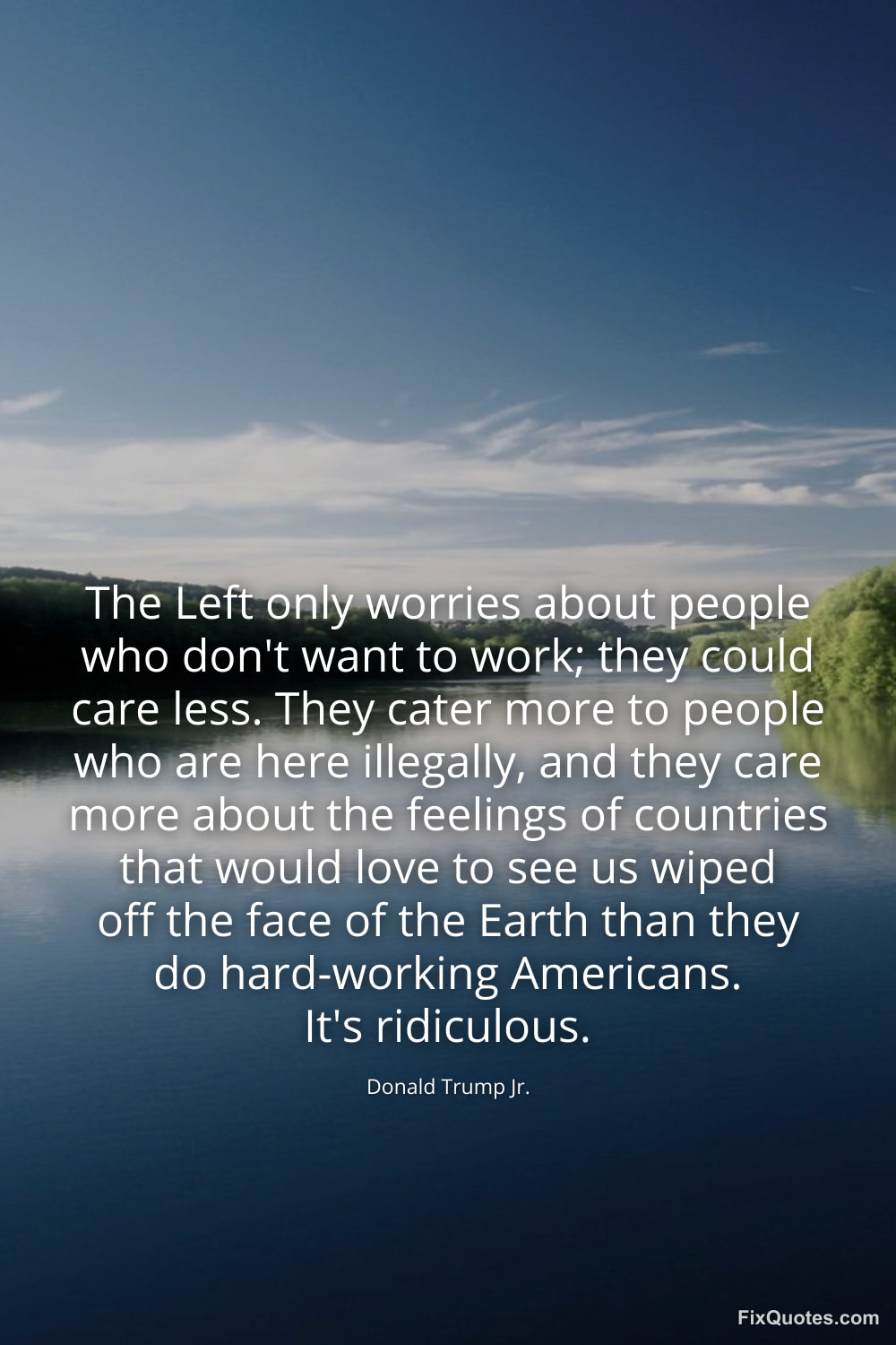 Jr., Donald Trump. "The Left only worries about people who don't want to work; they could care less. They cater more to people who are here illegally, and they care more about the feelings of countries that would love to see us wiped off the face of the Earth than they do hard-working Americans. It's ridiculous." FixQuotes. January 15, 2026. https://fixquotes.com/quotes/the-left-only-worries-about-people-who-dont-want-173267/.