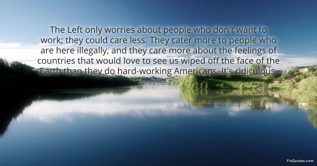 Jr., Donald Trump. (2026, January 15). The Left only worries about people who don't want to work; they could care less. They cater more to people who are here illegally, and they care more about the feelings of countries that would love to see us wiped off the face of the Earth than they do hard-working Americans. It's ridiculous. FixQuotes. https://fixquotes.com/quotes/the-left-only-worries-about-people-who-dont-want-173267/