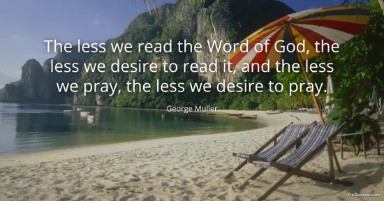Muller, George. "The less we read the Word of God, the less we desire to read it, and the less we pray, the less we desire to pray." FixQuotes. January 16, 2026. https://fixquotes.com/quotes/the-less-we-read-the-word-of-god-the-less-we-112382/.