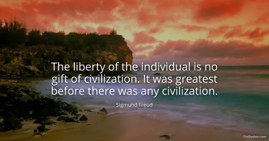 Freud, Sigmund. "The liberty of the individual is no gift of civilization. It was greatest before there was any civilization." FixQuotes. January 17, 2026. https://fixquotes.com/quotes/the-liberty-of-the-individual-is-no-gift-of-36066/.