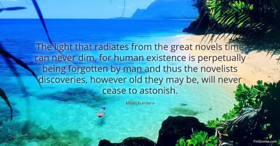 Kundera, Milan. "The light that radiates from the great novels time can never dim, for human existence is perpetually being forgotten by man and thus the novelists discoveries, however old they may be, will never cease to astonish." FixQuotes. January 16, 2026. https://fixquotes.com/quotes/the-light-that-radiates-from-the-great-novels-103751/.