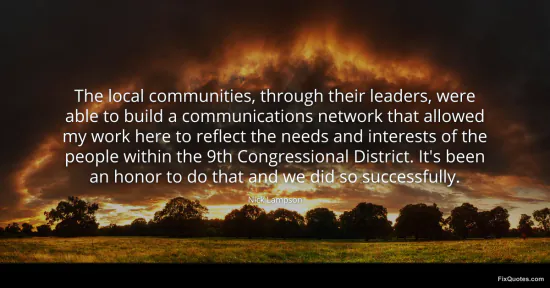 Lampson, Nick. (2026, January 17). The local communities, through their leaders, were able to build a communications network that allowed my work here to reflect the needs and interests of the people within the 9th Congressional District. It's been an honor to do that and we did so successfully. FixQuotes. https://fixquotes.com/quotes/the-local-communities-through-their-leaders-were-57971/