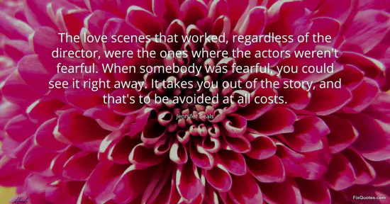 Beals, Jennifer. (2026, January 15). The love scenes that worked, regardless of the director, were the ones where the actors weren't fearful. When somebody was fearful, you could see it right away. It takes you out of the story, and that's to be avoided at all costs. FixQuotes. https://fixquotes.com/quotes/the-love-scenes-that-worked-regardless-of-the-67784/