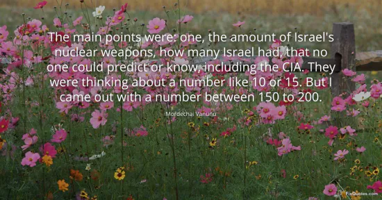 Vanunu, Mordechai. "The main points were: one, the amount of Israel's nuclear weapons, how many Israel had, that no one could predict or know, including the CIA. They were thinking about a number like 10 or 15. But I came out with a number between 150 to 200." FixQuotes. January 15, 2026. https://fixquotes.com/quotes/the-main-points-were-one-the-amount-of-israels-147770/.