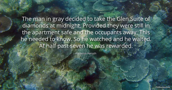Forsyth, Frederick. "The man in gray decided to take the Glen Suite of diamonds at midnight. Provided they were still in the apartment safe and the occupants away. This he needed to know. So he watched and he waited. At half past seven he was rewarded." FixQuotes. January 16, 2026. https://fixquotes.com/quotes/the-man-in-gray-decided-to-take-the-glen-suite-of-111736/.