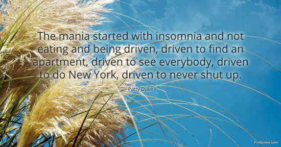 Duke, Patty. "The mania started with insomnia and not eating and being driven, driven to find an apartment, driven to see everybody, driven to do New York, driven to never shut up." FixQuotes. January 16, 2026. https://fixquotes.com/quotes/the-mania-started-with-insomnia-and-not-eating-100534/.