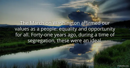 Boswell, Leonard. "The March on Washington affirmed our values as a people: equality and opportunity for all. Forty-one years ago, during a time of segregation, these were an ideal." FixQuotes. January 15, 2026. https://fixquotes.com/quotes/the-march-on-washington-affirmed-our-values-as-a-156570/.