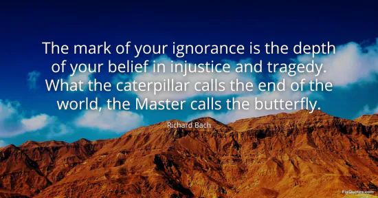 Bach, Richard. (2026, February 9). The mark of your ignorance is the depth of your belief in injustice and tragedy. What the caterpillar calls the end of the world, the Master calls the butterfly. FixQuotes. https://fixquotes.com/quotes/the-mark-of-your-ignorance-is-the-depth-of-your-9939/