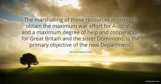 Holt, Harold Edward. "The marshalling of those resources in order to obtain the maximum war effort for Australia, and a maximum degree of help and cooperation for Great Britain and the sister Dominions, is the primary objective of the new Department." FixQuotes. January 15, 2026. https://fixquotes.com/quotes/the-marshalling-of-those-resources-in-order-to-162843/.