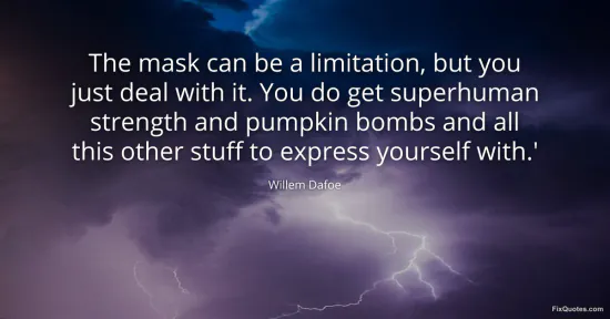 Dafoe, Willem. "The mask can be a limitation, but you just deal with it. You do get superhuman strength and pumpkin bombs and all this other stuff to express yourself with.'." FixQuotes. January 15, 2026. https://fixquotes.com/quotes/the-mask-can-be-a-limitation-but-you-just-deal-151623/.