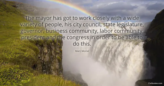 Morial, Marc. (2026, January 16). The mayor has got to work closely with a wide variety of people, his city council, state legislature, governor, business community, labor community, president and the congress in order to be able to do this. FixQuotes. https://fixquotes.com/quotes/the-mayor-has-got-to-work-closely-with-a-wide-102552/