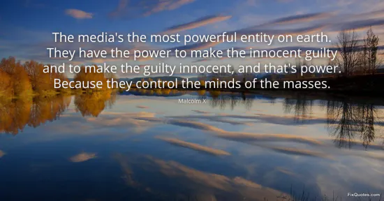 X, Malcolm. (2026, January 13). The media's the most powerful entity on earth. They have the power to make the innocent guilty and to make the guilty innocent, and that's power. Because they control the minds of the masses. FixQuotes. https://fixquotes.com/quotes/the-medias-the-most-powerful-entity-on-earth-they-2483/