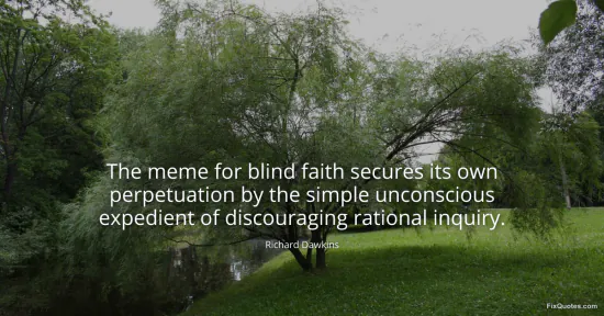 "The meme for blind faith secures its own perpetuation by the simple unconscious expedient of discouraging rational inquiry." FixQuotes, 18 Jan. 2026, https://fixquotes.com/quotes/the-meme-for-blind-faith-secures-its-own-1388/. Accessed 12 Feb. 2026.