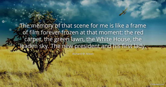 Nixon, Richard M. "The memory of that scene for me is like a frame of film forever frozen at that moment: the red carpet, the green lawn, the White House, the leaden sky. The new president and his first lady." FixQuotes. February 20, 2026. https://fixquotes.com/quotes/the-memory-of-that-scene-for-me-is-like-a-frame-17145/.