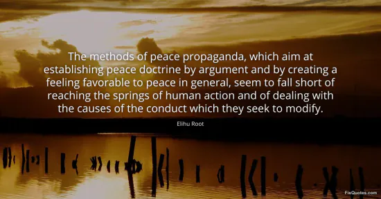 Root, Elihu. (2026, February 19). The methods of peace propaganda, which aim at establishing peace doctrine by argument and by creating a feeling favorable to peace in general, seem to fall short of reaching the springs of human action and of dealing with the causes of the conduct which they seek to modify. FixQuotes. https://fixquotes.com/quotes/the-methods-of-peace-propaganda-which-aim-at-53015/