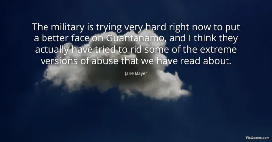 Mayer, Jane. "The military is trying very hard right now to put a better face on Guantanamo, and I think they actually have tried to rid some of the extreme versions of abuse that we have read about." FixQuotes. January 15, 2026. https://fixquotes.com/quotes/the-military-is-trying-very-hard-right-now-to-put-142865/.