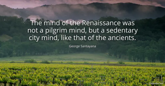 Santayana, George. "The mind of the Renaissance was not a pilgrim mind, but a sedentary city mind, like that of the ancients." FixQuotes. January 17, 2026. https://fixquotes.com/quotes/the-mind-of-the-renaissance-was-not-a-pilgrim-25168/.