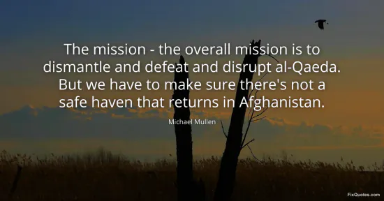 Mullen, Michael. (2026, January 15). The mission - the overall mission is to dismantle and defeat and disrupt al-Qaeda. But we have to make sure there's not a safe haven that returns in Afghanistan. FixQuotes. https://fixquotes.com/quotes/the-mission-the-overall-mission-is-to-dismantle-152936/