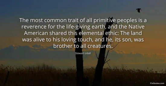 Udall, Stewart. (2026, January 15). The most common trait of all primitive peoples is a reverence for the life-giving earth, and the Native American shared this elemental ethic: The land was alive to his loving touch, and he, its son, was brother to all creatures. FixQuotes. https://fixquotes.com/quotes/the-most-common-trait-of-all-primitive-peoples-is-117016/