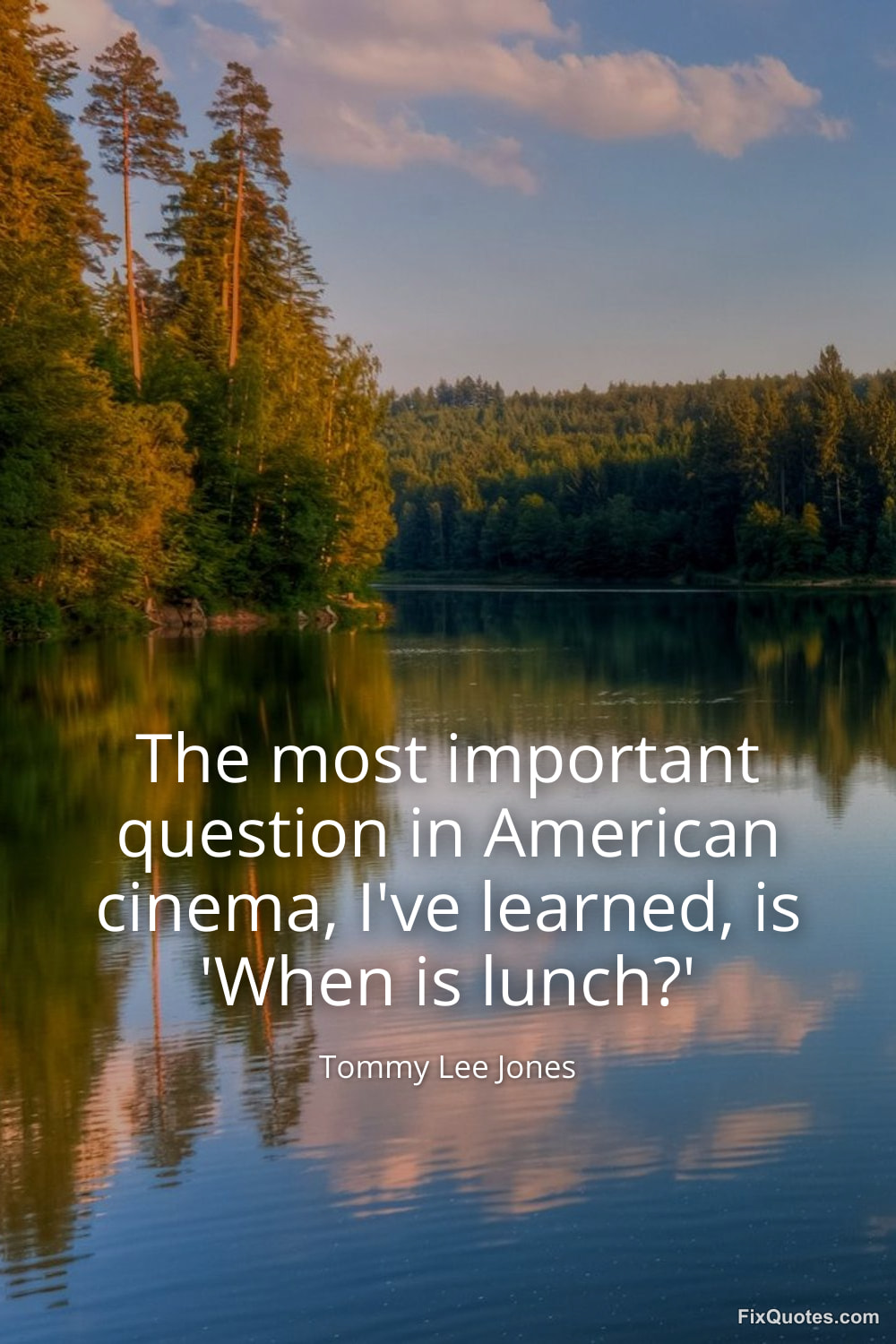 Jones, Tommy Lee. (2026, January 11). The most important question in American cinema, I've learned, is 'When is lunch?'. FixQuotes. https://fixquotes.com/quotes/the-most-important-question-in-american-cinema-183738/