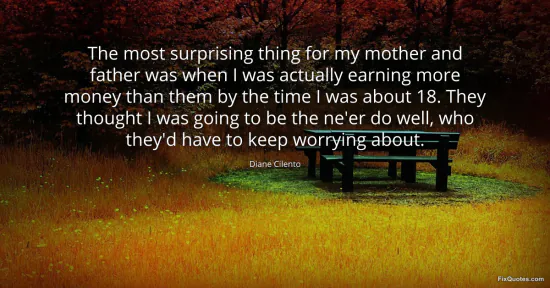 Cilento, Diane. "The most surprising thing for my mother and father was when I was actually earning more money than them by the time I was about 18. They thought I was going to be the ne'er do well, who they'd have to keep worrying about." FixQuotes. January 15, 2026. https://fixquotes.com/quotes/the-most-surprising-thing-for-my-mother-and-145828/.