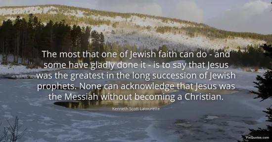 Latourette, Kenneth Scott. "The most that one of Jewish faith can do - and some have gladly done it - is to say that Jesus was the greatest in the long succession of Jewish prophets. None can acknowledge that Jesus was the Messiah without becoming a Christian." FixQuotes. January 15, 2026. https://fixquotes.com/quotes/the-most-that-one-of-jewish-faith-can-do-and-144295/.
