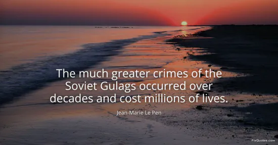 Pen, Jean-Marie Le. (2026, January 16). The much greater crimes of the Soviet Gulags occurred over decades and cost millions of lives. FixQuotes. https://fixquotes.com/quotes/the-much-greater-crimes-of-the-soviet-gulags-85678/