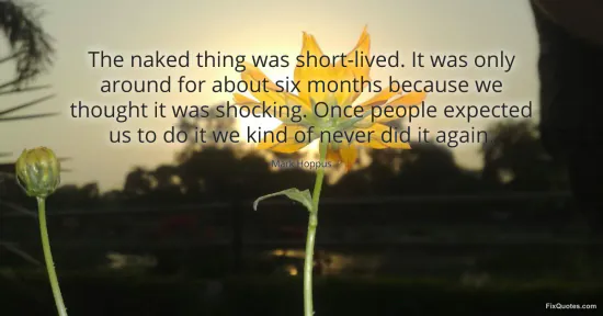 "The naked thing was short-lived. It was only around for about six months because we thought it was shocking. Once people expected us to do it we kind of never did it again." FixQuotes, 16 Jan. 2026, https://fixquotes.com/quotes/the-naked-thing-was-short-lived-it-was-only-121615/. Accessed 5 Feb. 2026.