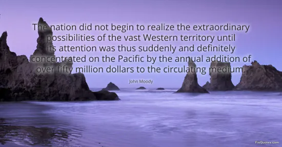 Moody, John. (2026, January 16). The nation did not begin to realize the extraordinary possibilities of the vast Western territory until its attention was thus suddenly and definitely concentrated on the Pacific by the annual addition of over fifty million dollars to the circulating medium. FixQuotes. https://fixquotes.com/quotes/the-nation-did-not-begin-to-realize-the-100776/