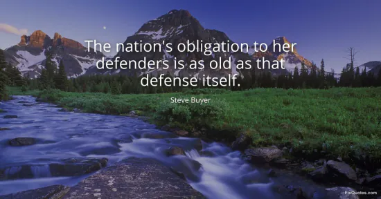 Buyer, Steve. "The nation's obligation to her defenders is as old as that defense itself." FixQuotes. January 15, 2026. https://fixquotes.com/quotes/the-nations-obligation-to-her-defenders-is-as-old-162116/.